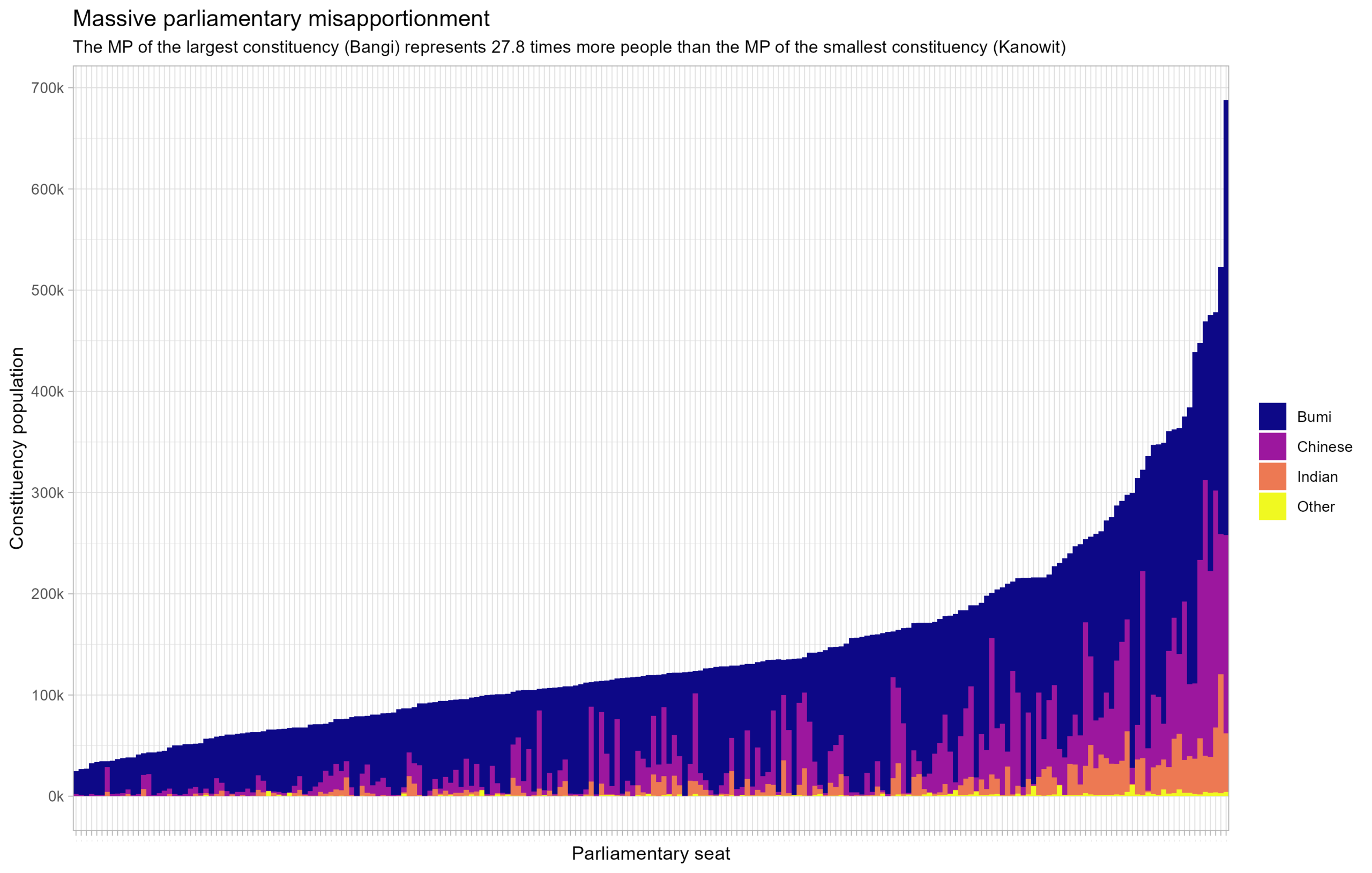 The major issues facing Malaysia’s electoral system remain shockingly numerous: malapportionment, lack of judicial independence, partisanship of the Electoral Commission and other institutions, racialisation of politics and Malay supremacism, restrictions on political speech and civil society, discrepancies in vote tallying, vote buying and clientalisation of key voting blocs, post-election manipulations, capture of institutional media by political parties and mass corruption. We will be looking through election ballot data compiled by Thevesh to explore some of these issues and quantify them.