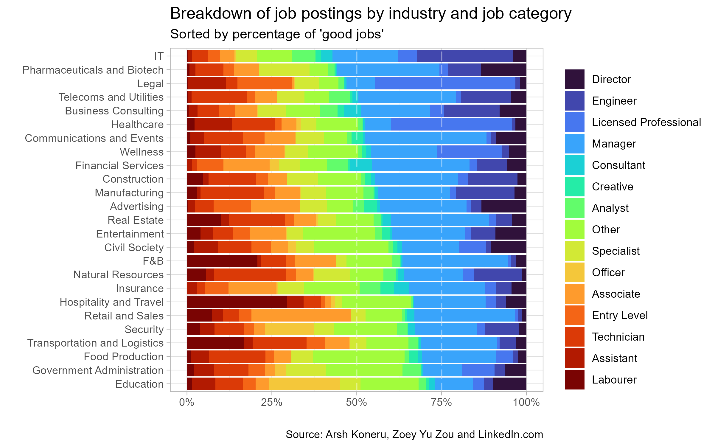 Looking at the five largest industries by number of job postings, we can confirm several things that we already likely know from cultural osmosis: IT is a large and well-compensated industry. Healthcare and Manufacturing, whilst having many new jobs, have middling salaries, on average. There are a large number of poorly-compensated retail jobs.